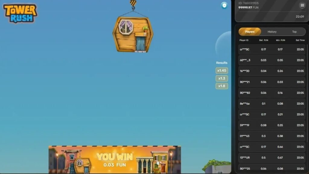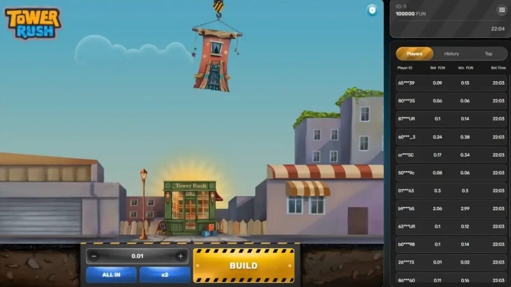 Tower Rush parte de un concepto sencillo pero altamente adictivo: durante cada ronda, la persona controla una grúa virtual encargada de sostener una casa sobre una torre. El objetivo consiste en decidir el momento exacto para soltar el bloque y así construir pisos lo más alineados posibles. Cada acierto preciso suma un multiplicador a las ganancias acumuladas, aumentando la tensión y el potencial de recompensa.